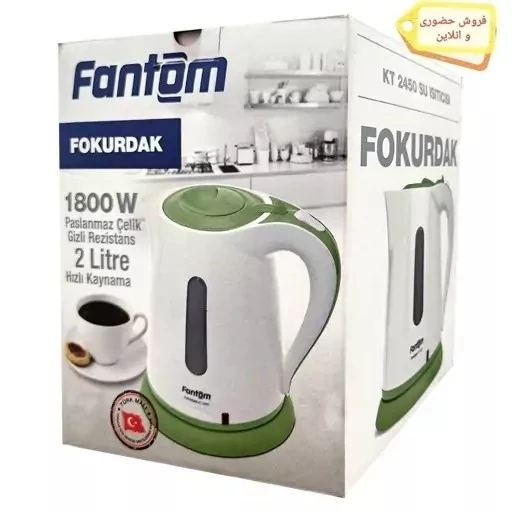 کتری برقی فانتوم ساخت ترکیه،ظرفیت مخزن آب 2 لیتری ، المنت مخفی از استیل ضد زنگ و قابلیت جوش سریع است.علاوه بر این، به لطف بدنه محصول با چرخش 360 درجه، به شما امکان می دهد دستگاه خود را بدون اتصال به کابل حرکت دهید. سیستم ایمنی که از عملکرد بدون آب جلوگیری می کند، در مصرف انرژی صرفه جویی کرده و قابلیت خودکار خاموشی در موقع جوشیدن آب نیز از دیگر ویژگی های این کتری برقی است. محصول کتری برقی فانتوم مدل KT-2450 با ظاهری زیبا و قدرت 1800 وات، یکی از وسایل بسیار کاربردی در آشپزخانه های هر خانه، دفتر با محل کار شما است. این کتری قابلیت جوشاندن حداکثر 2 لیتر آب را در کوتاهترین زمان ممکن دارد. همچنین، چراغ LED آن، امکان مشاهده وضعیت جوش آب را به شما می دهد.