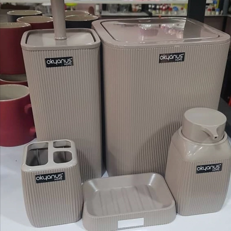 ست سرویس بهداشتی 5 پارچه اقیانوس دارای سطل آشغال 23سانتی متری ، فرچه همراه با ظرف 33سانتی متر ، جا صابونی مایع 16سانتی متر ، جا مسواک 13سانتی متر و جا صابونی 9سانتی متر می باشد .