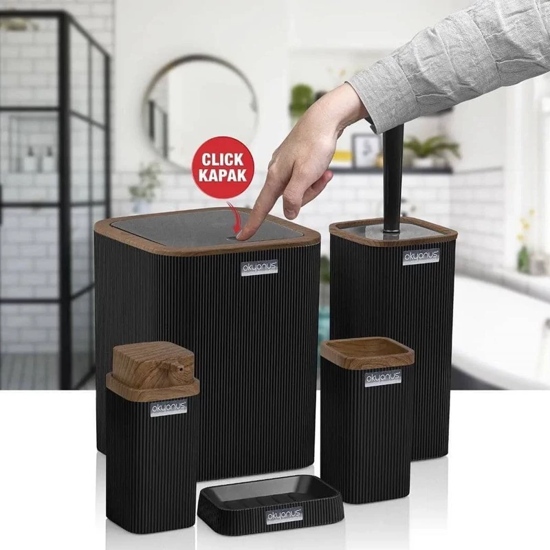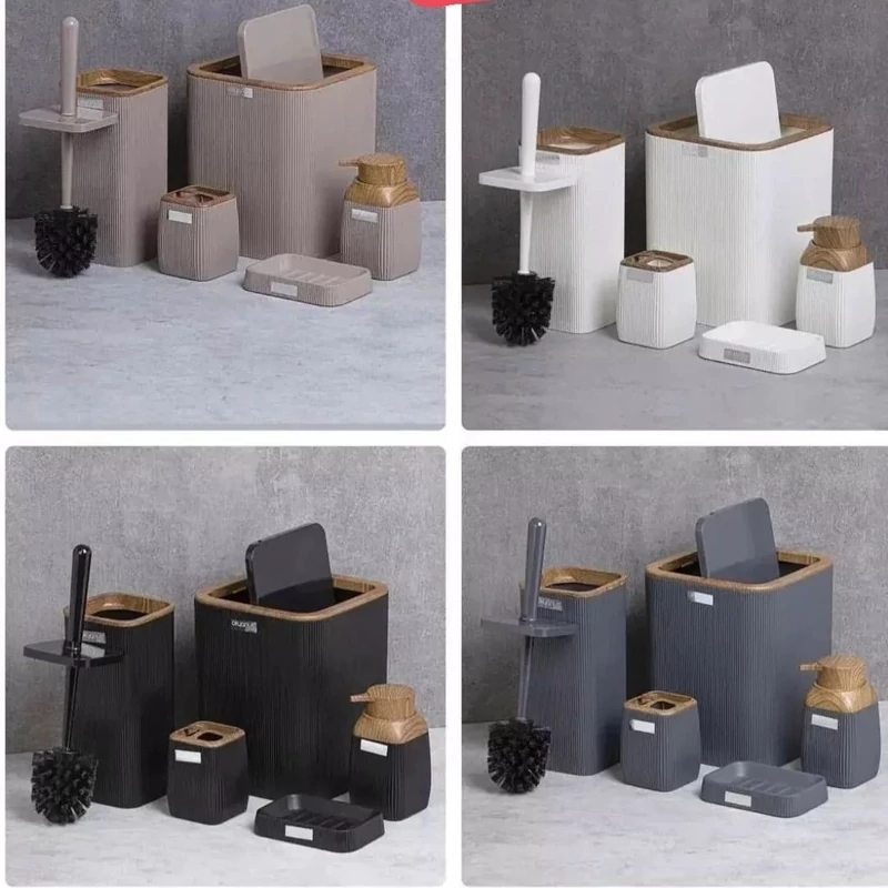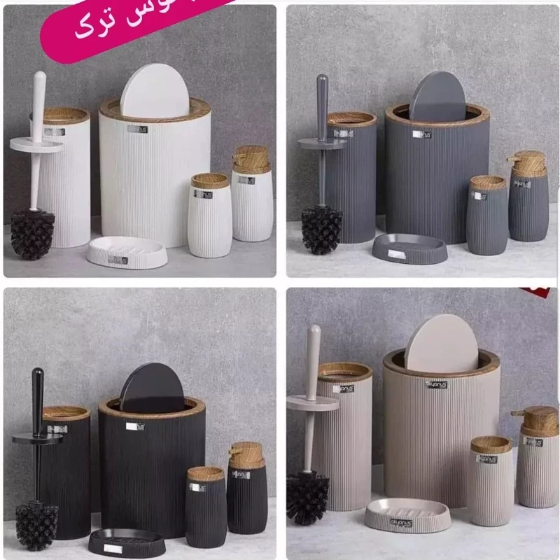 سطل آشغال ، فرچه ، جا صابونی ، جا مایع و جامسواکی می باشد .